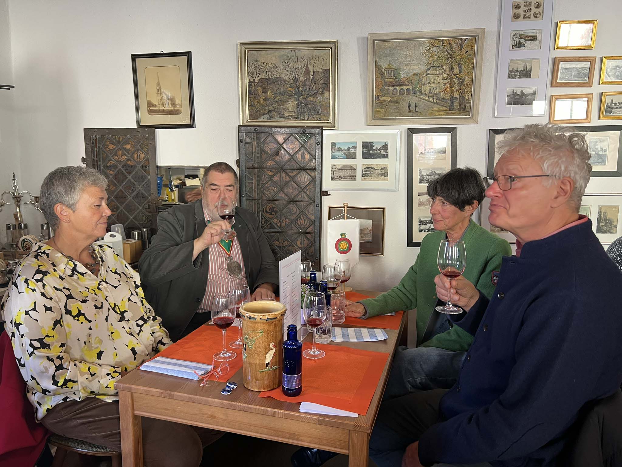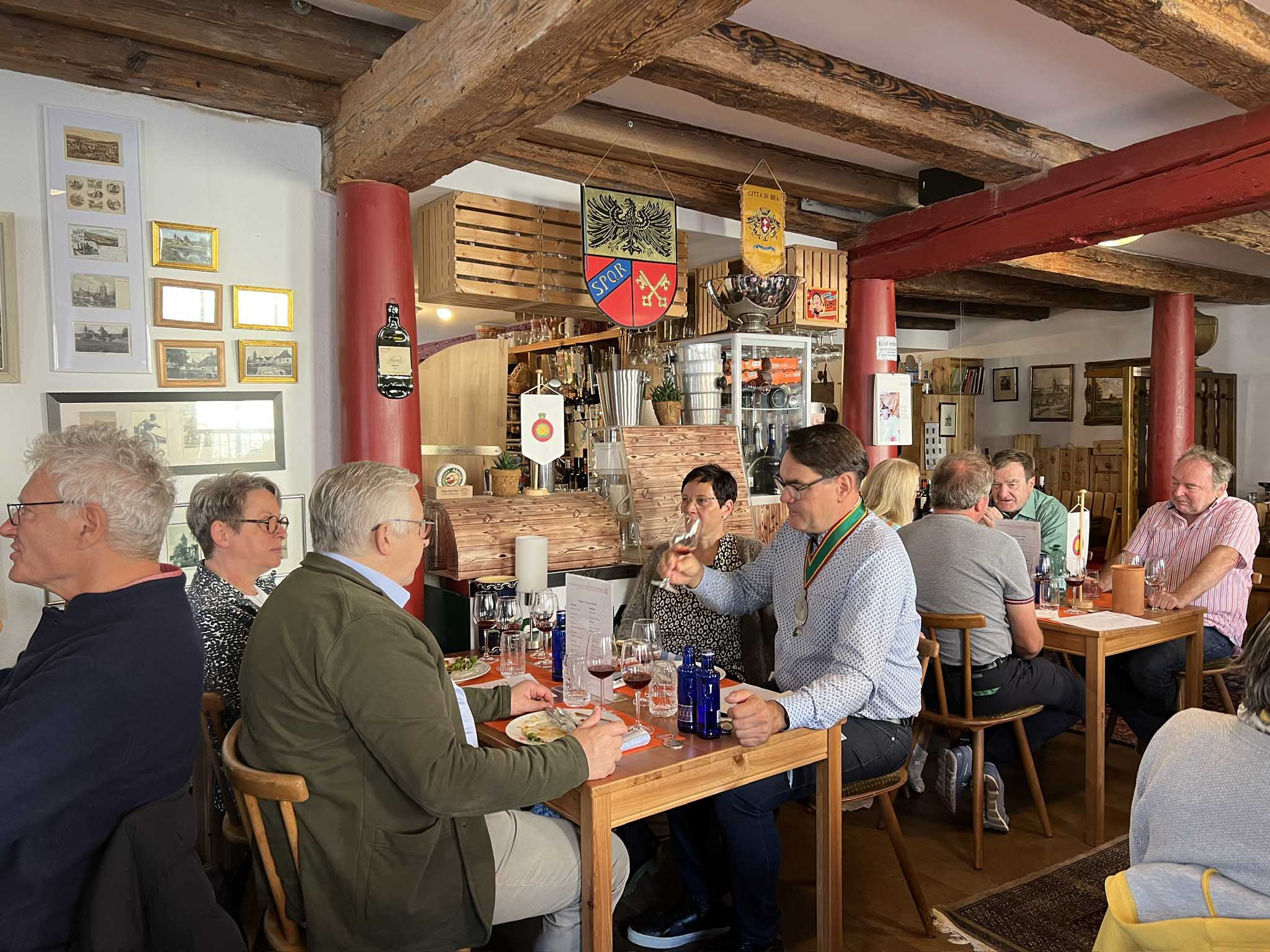 Im Gegensatz zu den Vorjahren hat das Wetter den Begriff Spätsommerfest bei Temperaturen um 14°C etwas konterkariert. Auch wenn die Veranstaltung, bei der sieben Trollinger aus Württemberg im direkten Vergleich gegen sieben Vernatsch aus Südtirol verkostet werden konnten, also im Innenraum des Rössle stattfinden musste, war es für die 32 Teilnehmer doch ein tolles Erlebnis.