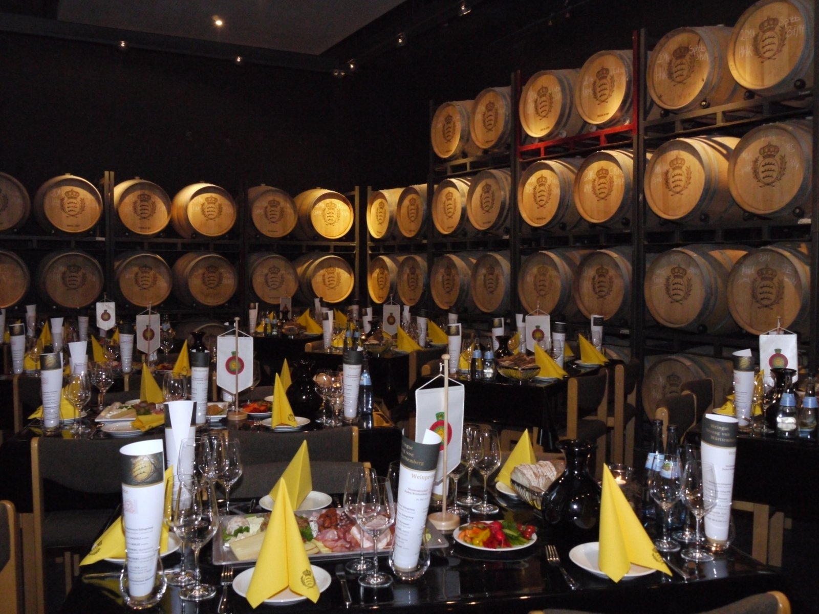 In der Vinothek begrüßte uns als Referentin die württembergische Weinkönigin Andrea Ritz mit einer Secco-Cuvee Riesling/Traminer. Anschließend gings in den im Keller liegenden Weinverkostungsraum. In einem wunderbaren Ambiente, umgeben von Barrique-Fässern, konnten wir uns mit einem liebevoll zusammengestellten Vesper stärken.