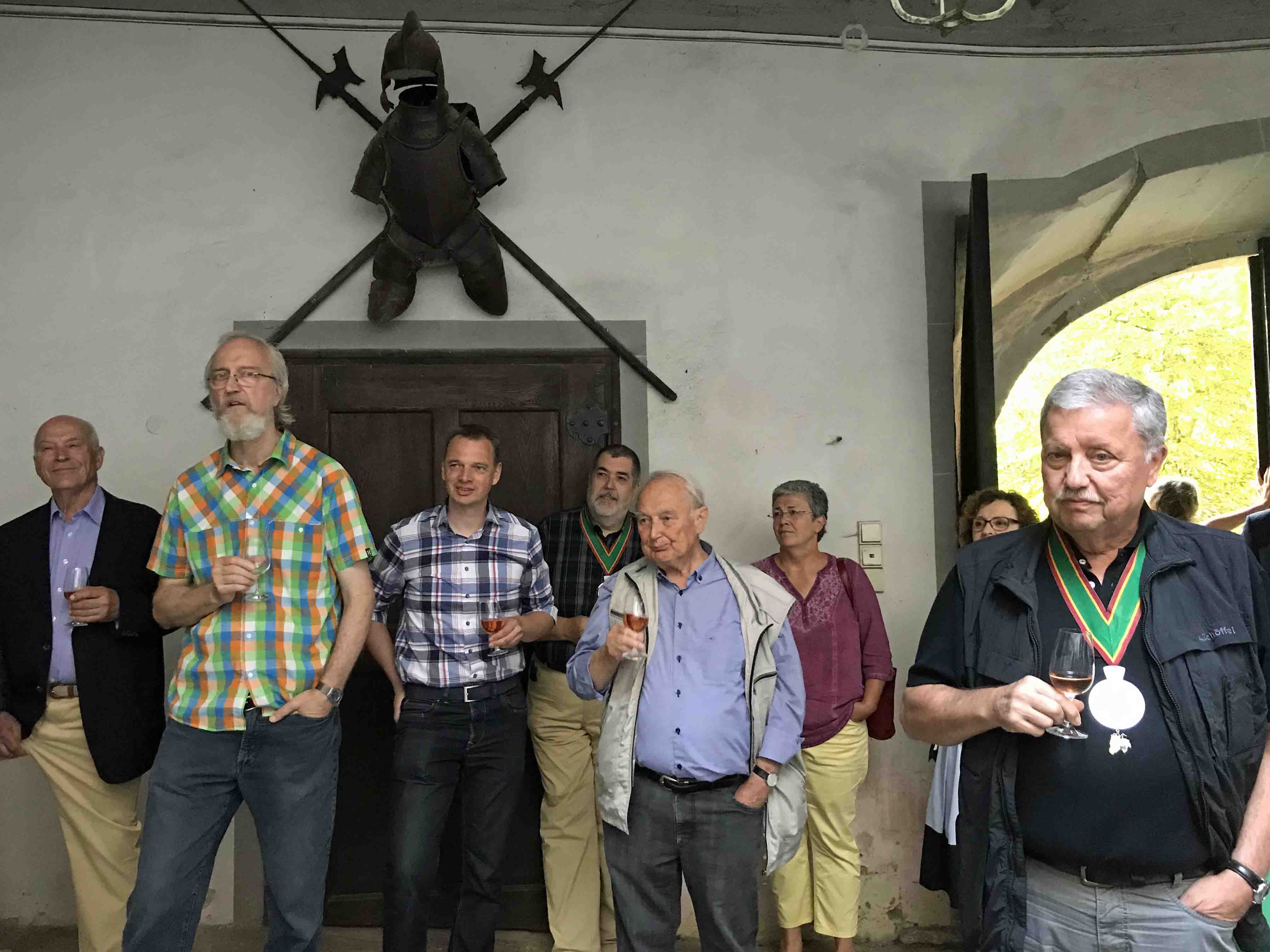 Im Anschluss führten unsere Weinbrüder Peter Albrecht, der 37 Jahre lang Kellermeister bei Adelmann war und Gert Hiller durch das breite Sortiment des Weingutes. Nach einem 2018er Weißburgunder und der Weißweincuvée „Der Weiße Löwe“ sowie einem Grauburgunder, beide aus dem Jahr 2017, wurden drei Weine nebeneinander eingeschenkt, die mit Spannung erwartet worden waren, sollte doch das Alter bestimmt werden. Erstaunlich, wie die Süßmund Riesling 1995, dieser mit deutlichem Petrolton, die Kerner Auslese von 1981 und vor allem die Muskateller Auslese 1996 sich noch gut trinkbar präsentierten.
