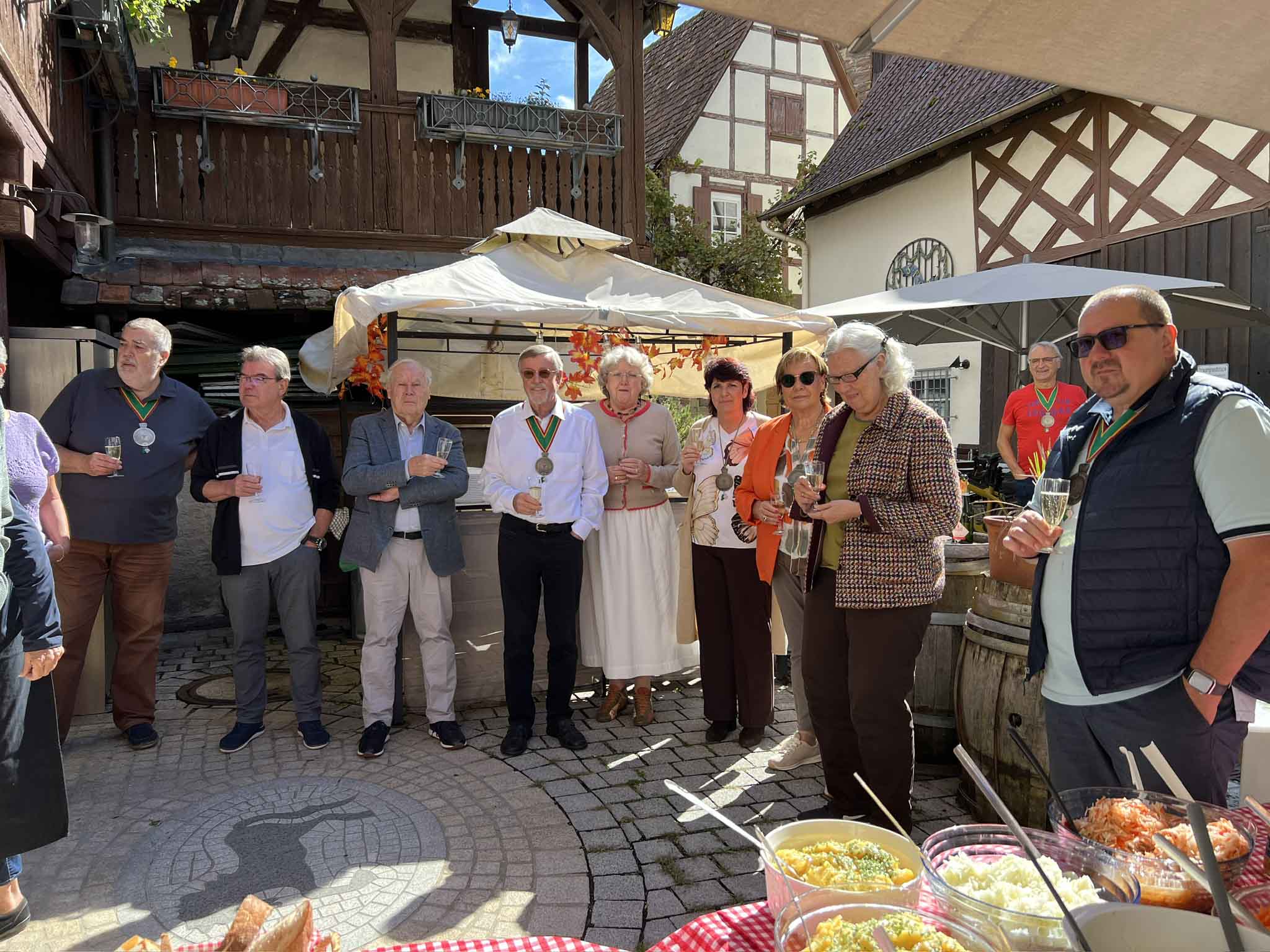 Auch in diesem Jahr hat das Wetter es nicht allzu gut gemeint mit unserem Spätsommerfest. Immerhin ließ sich zu Beginn die Sonne kurz blicken, so dass wenigstens der Crémant von Dopff im Freien verkostet werden konnte. Weine aus dem Elsass standen in diesem Jahr auf dem Programm.